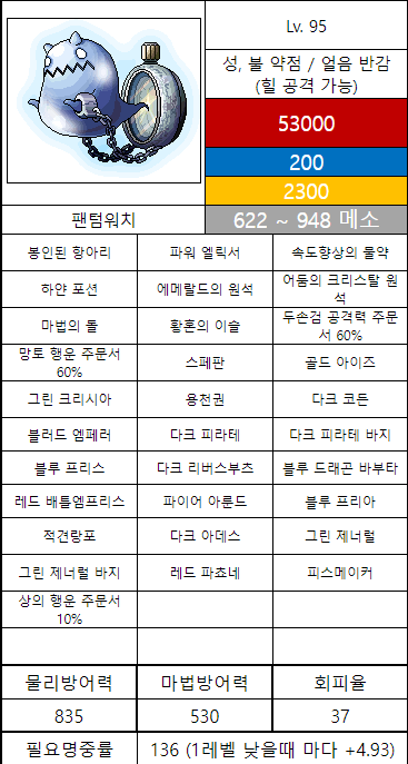 팬텀워치도 데스테니와 마찬가지로 성, 불 속성 약점을 가지고 있습니다.