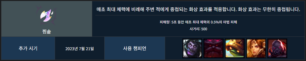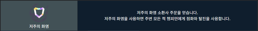 꽤 넓은 범위 안의 챔피언 모두에게 점화와 탈진을 걸어줍니다.