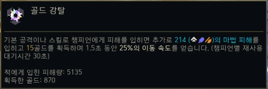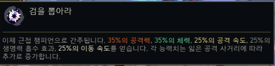 상시 30% 이속 증가가 붙어서 신발을 안 사도 이속이 커버되고 강심을 가는 탱커들 상대로 굉장한 폭딜이 뽑힙니다.