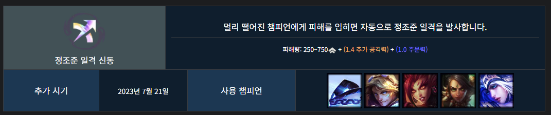딜이 그렇게 센 편은 아니라 조금 애매합니다. 이즈리얼의 원조 정조준 일격에 비해 투사체의 속도가 좀 느립니다.